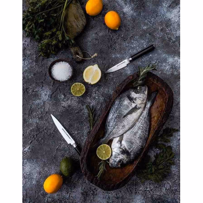 Tento nůž na ovoce a zeleninu je vyrobený z damaškové oceli a je součástí produktové řady Damascus. Je extrémně lehký (pouze 90 g), má dokonale nabroušené oboustranné ostří a velmi odolnou a ergonomickou rukojeť vyrobenou z nehořlavého materiálu G-10.