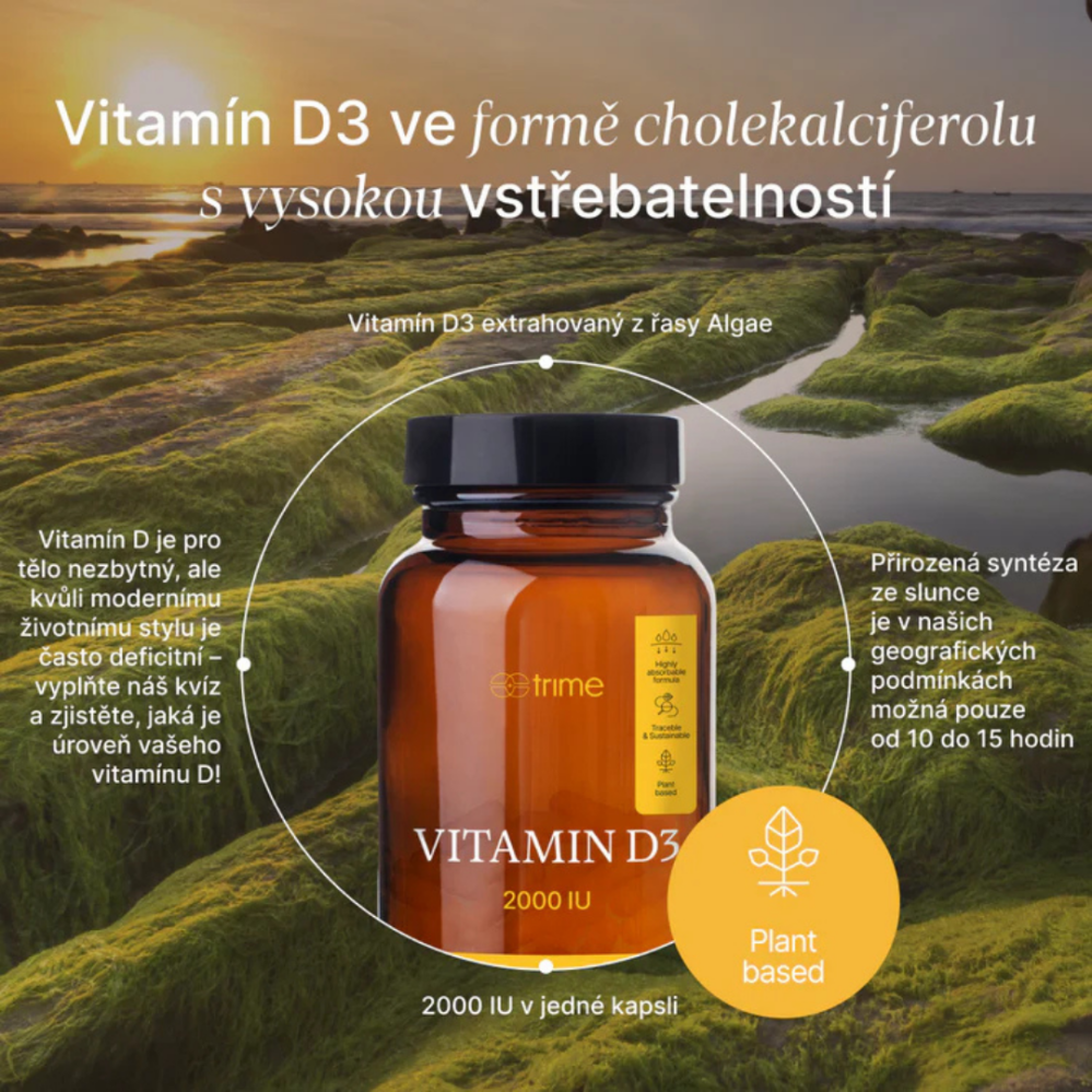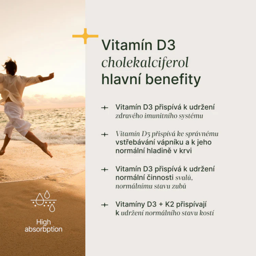 Vitamín D je pro lidské tělo nepostradatelný, přesto v důsledku moderního životního stylu často deficitní. Jeho syntéza ze slunce je navíc v našich geografických šířkách možná pouze od května do září, a to zhruba od 10 do 15 hodin. Vitamín D reguluje vstřebávání vápníku a fosforu, čímž ovlivňuje zdraví kostí a zubů. Významně přispívá k normální činnosti svalů a podporuje funkci imunitního systému. Je získáván extrakcí z geneticky nemodifikované mořské řasy Algae.